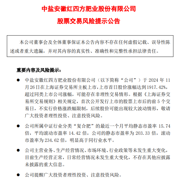 红四方11月26日公告,公司于2024年11月26日上市,上市首日股价涨幅达到1917.42%,超过同类上市公司涨幅,可能存在非理性交易情形。公司所属中证行业分类“复合肥”的最近一个月平均静态市盈率15.74倍,平均滚动市盈率14.42倍,公司静态市盈率为203.33倍,滚动市盈率为234.62倍,明显高于同行业水平。公司主营业务、生产经营情况、市场环境、行业政策等未发生重大变化,目前生产经营正常,日常经营情况未发生重大变化,不存在其他应披露未披露的重大信息。