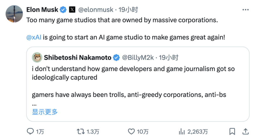 马斯克在社交媒体上表示:“太多的游戏工作室归大型公司所有。xAI将创办一家人工智能游戏工作室,让游戏再次变得伟大!”