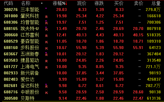 人形机器人概念盘中走势活跃,截至收盘,三丰智能、肇民科技20%涨停斩获两连板,埃夫特-U、江苏雷利、豪森智能、步科股份等涨超10%。