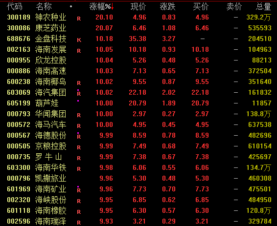 海南自贸概念盘中强势拉升,个股掀涨停潮。截至收盘,神农种业、康芝药业、海南发展、海南高速、海汽集团、海马汽车等逾20股涨停,金盘科技涨超10%。