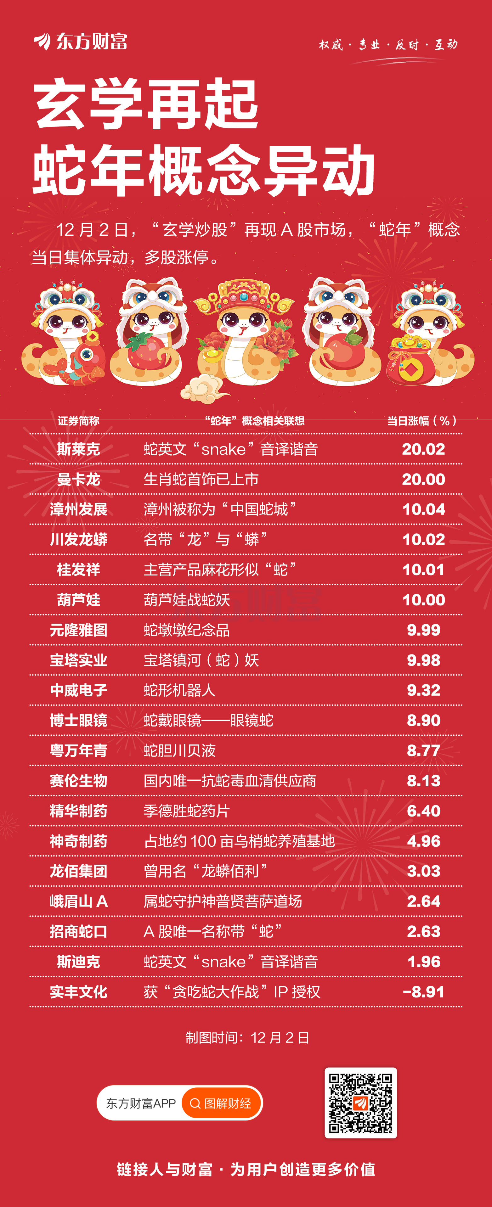 玄学炒股的风再次在A股刮起,12月2日,A股“蛇年”概念集体异动,多股涨停。