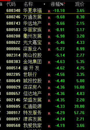 下跌方面,地产股震荡走低,华夏幸福跌停,万通发展、华远地产、光大嘉宝等跌超5%。