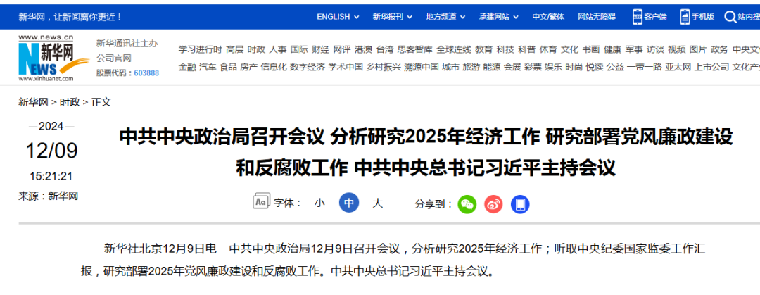12月9日,A股收盘后半小时,新华社发布重磅消息,中共中央政治局12月9日召开会议,分析研究2025年经济工作!