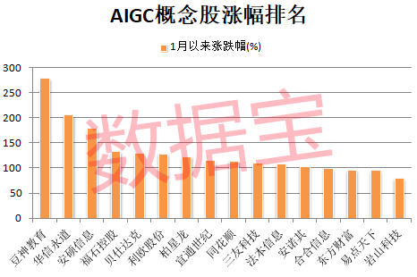 据证券时报·数据宝统计,截至12月9日,涉及AIGC的概念股接近200只,合计A股市值接近3万亿元。今年以来有12只概念股累计涨幅翻倍,包括豆神教育、华信永道、安硕信息、福石控股、贝仕达克等。豆神教育累计涨幅279.64%,高居榜首。该公司始终致力于持续深化人工智能生成内容(AIGC)技术在业务中的应用,已于10月30日正式发布全新超拟人AI智教产品。