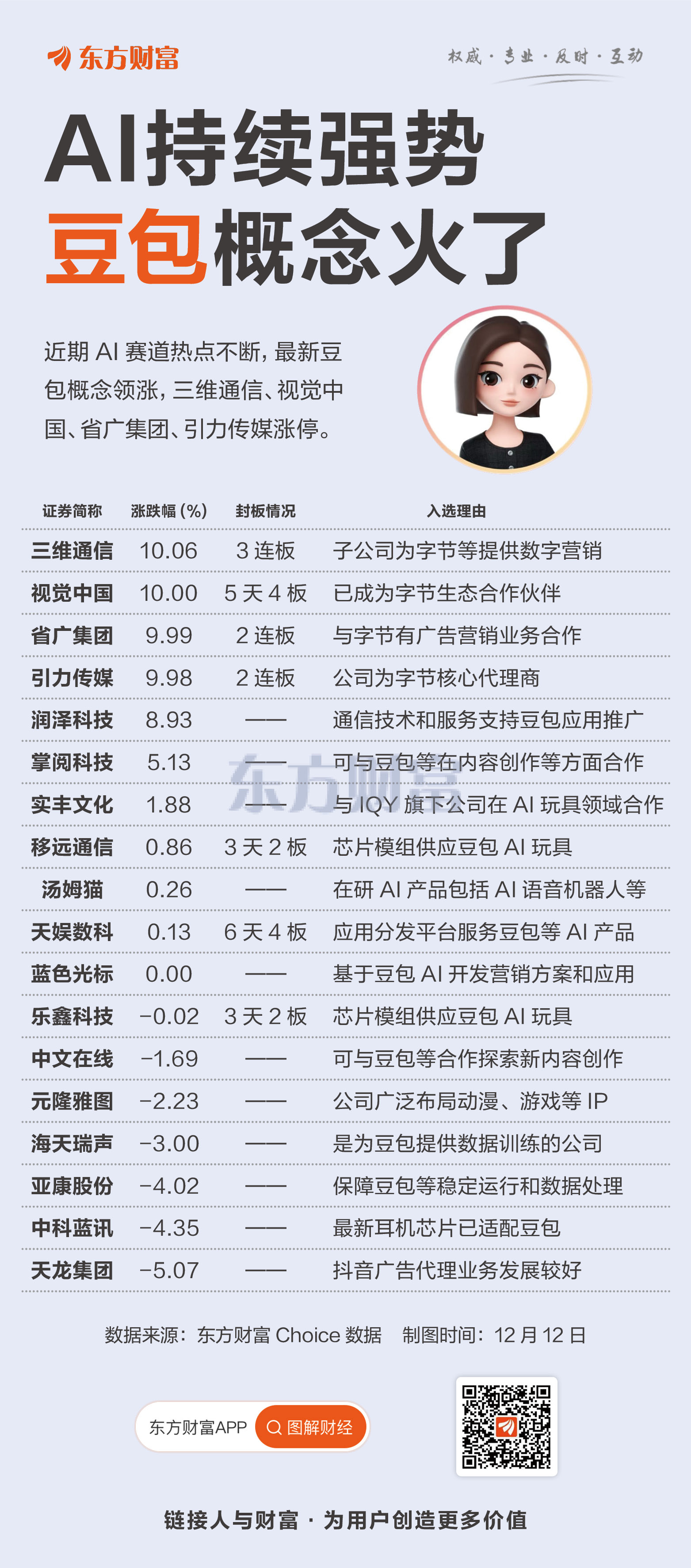 12月12日,抖音豆包概念继续领涨AI赛道,板块中三维通信(3连板)、视觉中国(5天4板)、省广集团(2连板)、引力传媒(2连板)纷纷涨停。
