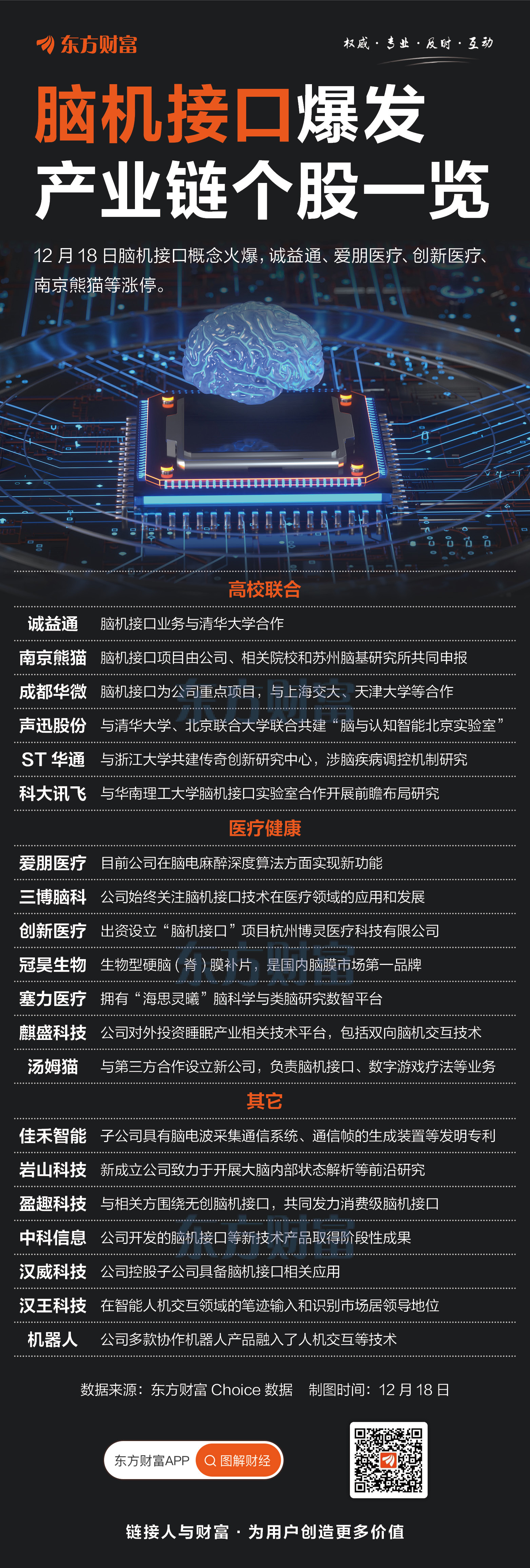 12月18日,脑机接口板块掀起涨停潮,其中爱朋医疗、诚益通20CM涨停;创新医疗、岩山科技、南京熊猫、盈趣科技、麒盛科技也是涨停收盘。