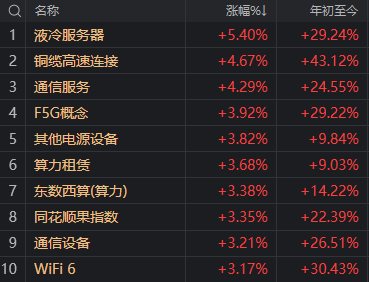 截至收盘,AI硬件端集体走强,铜缆高速连接、液冷服务器、光模块等板块涨幅居前。