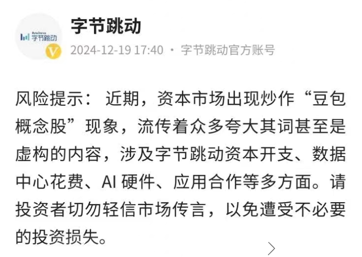12月19日,字节跳动发布风险提示:近期,资本市场出现炒作“豆包概念股”现象,流传着众多夸大其词甚至是虚构的内容,涉及字节跳动资本开支、数据中心花费、AI 硬件、应用合作等多方面。请投资者切勿轻信市场传言,以免遭受不必要的投资损失。
