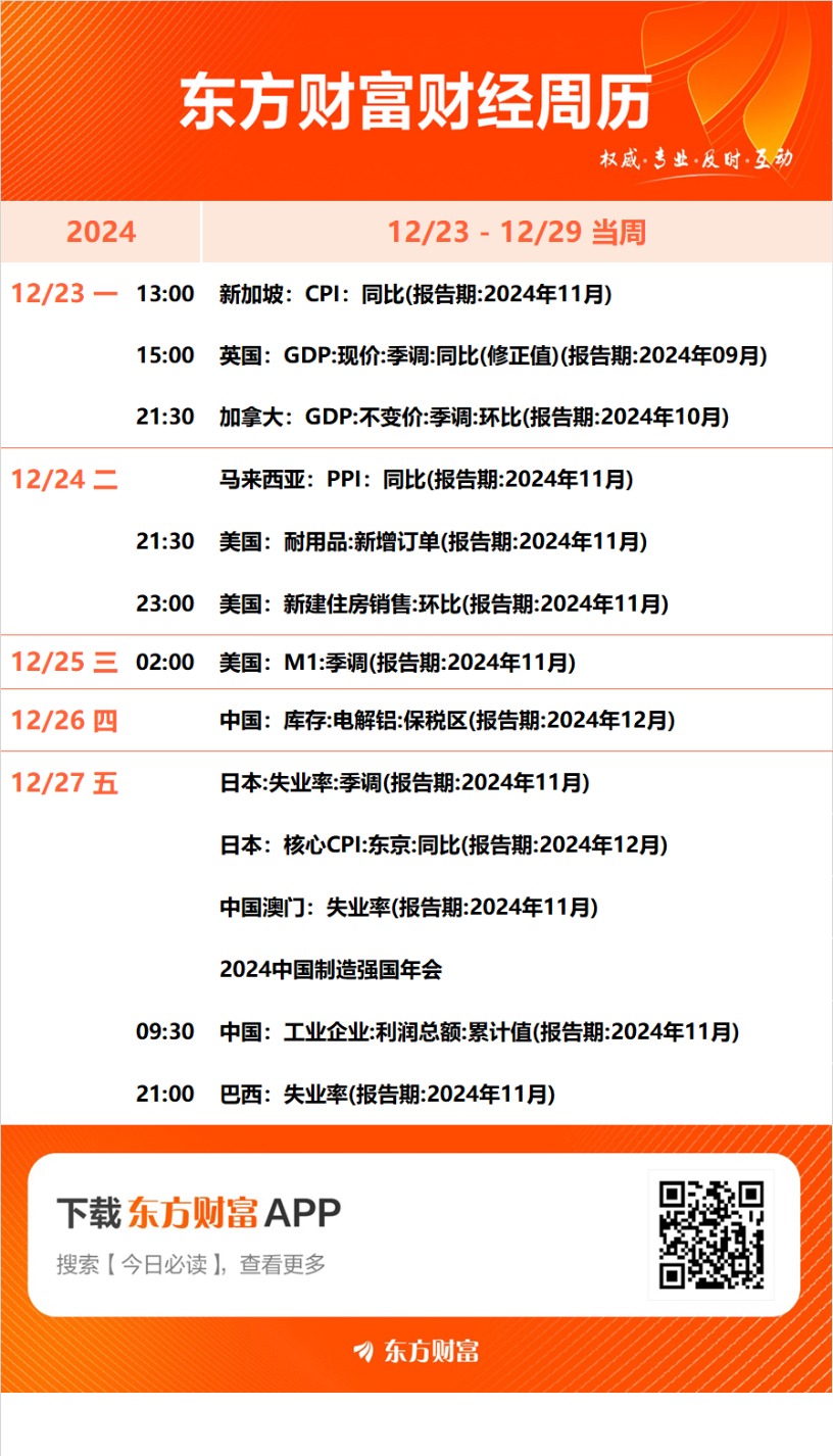 下周重要日程:12月23日至12月29日当周重要财经事件一览