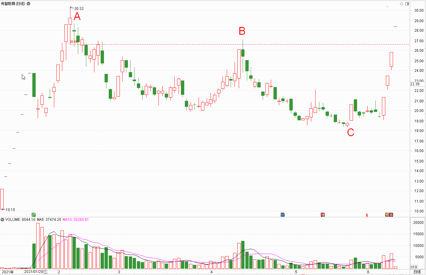 例如上图的传智教育,B峰的价柱刺破了A峰A柱的虚底,可以说刺得很深了,但它脚下的量与A峰的量相比,却没有什么量,这说明左侧进去的大量资金没有跑,也不想跑。为什么不想跑?只有一个解释,那就还想做多呗!