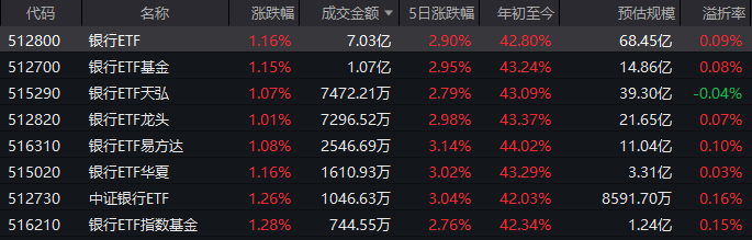 目前最主流的中证银行指数,有8只ETF跟踪。虽然这些产品今日涨幅都在1%出头,但它们的规模和流动性整体更可观,年内收益也都在40%以上,溢价率整体不到0.1%。