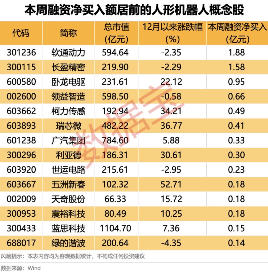 40余只人形机器人概念股本周获得融资客加仓,其中软通动力、长盈精密获得超1亿元融资净买入;还有卧龙电驱、领益智造、柯力传感、瑞芯微、广汽集团的融资净买入额居前。