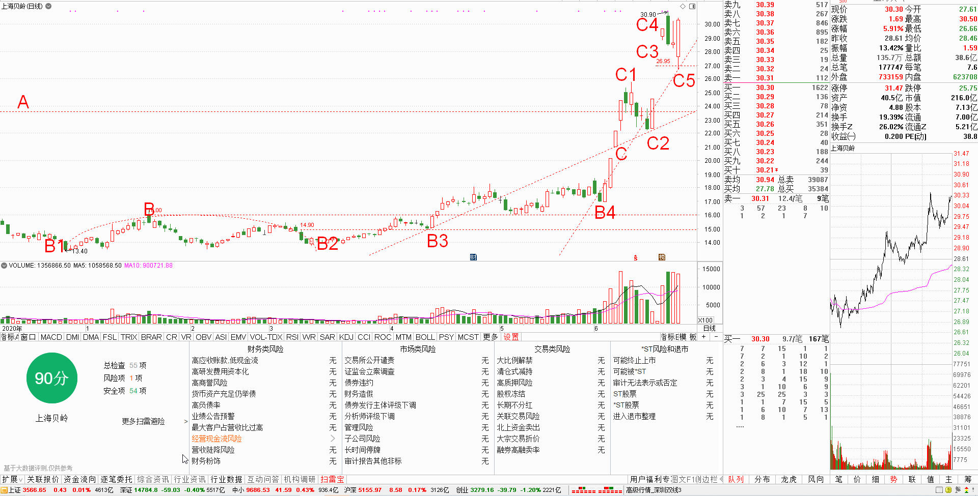 又比如上面上海贝岭的C3处,很多人可能都会说是高位吧,因为它从脚下的B1涨到前天,最高涨幅已经超过130%!但是,在我们的眼里,它依然是“低位”,因为它在砸到B4-C2和C3的黄金交叉点时,也止跌掉头向上了,见底的信号很明显,因此,在这个点位掉头的时候也是可以“低吸”的,明后回踩B4-C2烽火线不破掉头时,还是可以视机“低吸”的。