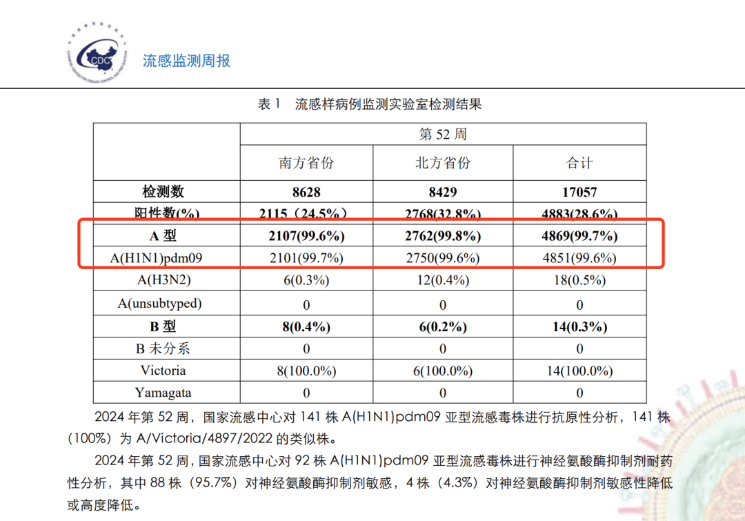 据中国疾控中心最新数据,目前流感病毒阳性率持续上升,南、北方流感病毒阳性率,99%以上为甲型H1N1流感亚型。
