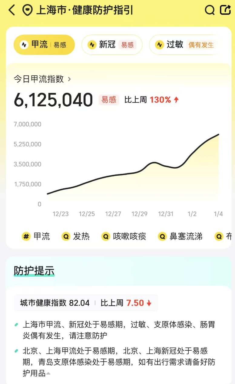 2024年12月31日,上海市疾控中心发布提示:目前本市流感病毒活动强度明显增强,已进入高发期,但流行强度处于历年一般水平。