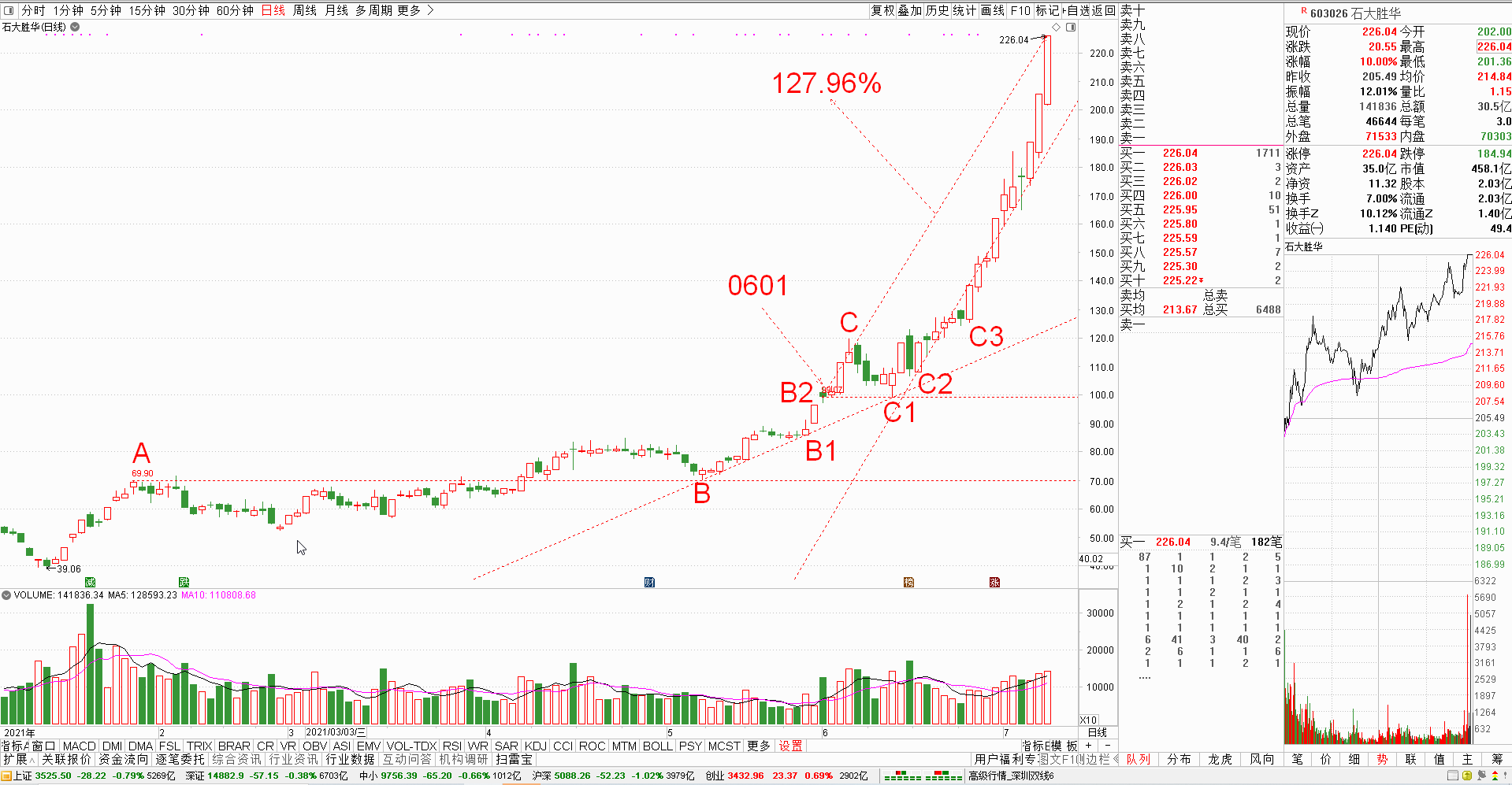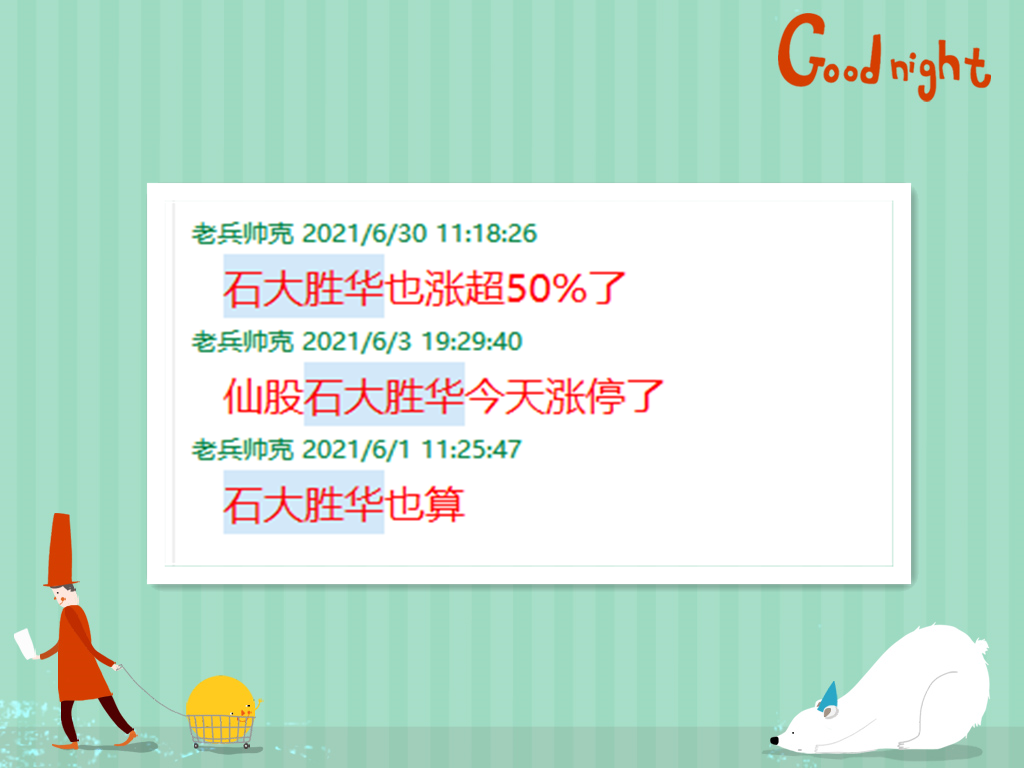 但是,这样的“仙股”要怎样才能捕获呢? 今年6月1日的时候,我在线下课同学群里跟大家分享了一只有望成为“仙股”的股票——石大胜华。而结果,它也终于不负厚望,仅用一个来月的时间,就从99.07元涨到了226.04元,区间最大涨幅为127.96%,我的预判,获得了精彩地应验。