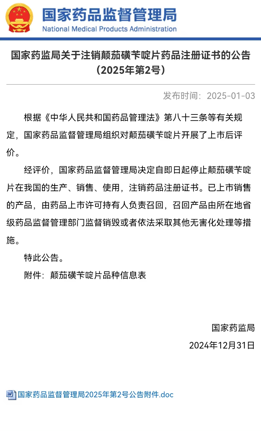 1月3日,国家药监局官网发布了关于注销颠茄磺苄啶片药品注册证书的公告,停止颠茄磺苄啶片在我国的生产、销售、使用,注销药品注册证书。已上市销售的产品,由药品上市许可持有人负责召回,召回产品由所在地省级药品监督管理部门监督销毁或者依法采取其他无害化处理等措施。