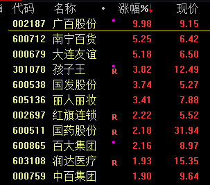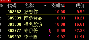 食品、零售等消费股盘中拉升,好想你、来伊份、李子园、广百股份等封板。
