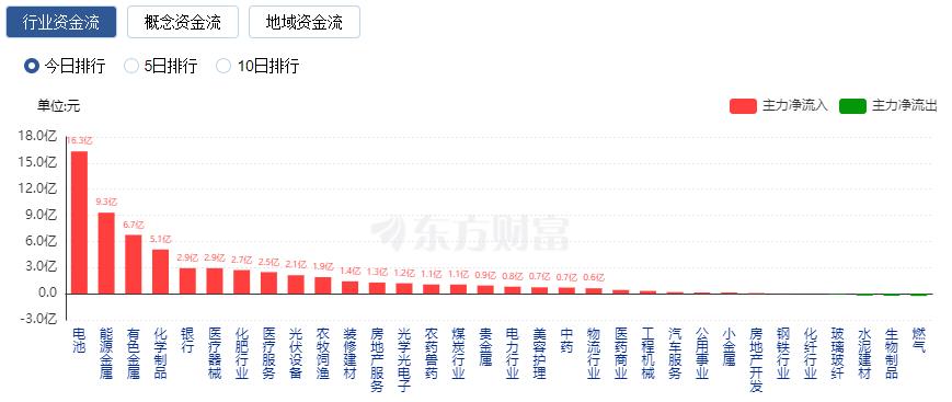 行业资金方面,截至收盘,电池、能源金属、有色金属等净流入排名靠前,其中电池净流入16.34亿。
