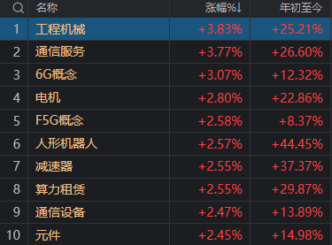 板块方面,工程机械、人形机器人、算力租赁、商业航天等板块涨幅居前,光伏设备、房地产、医药商业、化肥等板块跌幅居前。