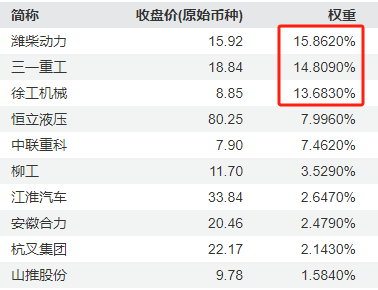数据显示,相关产品跟踪的中证工程机械主题指数,可以说主要重仓了3只股票——潍柴动力、三一重工、徐工机械,合计权重占比超44%。
