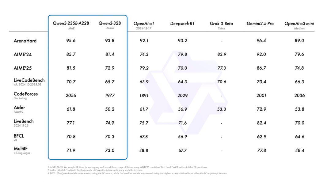 其中,在奥数水平的AIME25测评中,千问3获得81.5分,刷新开源纪录;在考察代码能力的Live Code Bench测评中,千问3突破70分大关,表现超过Grok3;在评估模型人类偏好对齐的Arena Hard测评中,千问3以95.6分超越OpenAI-o1及DeepSeek-R1。