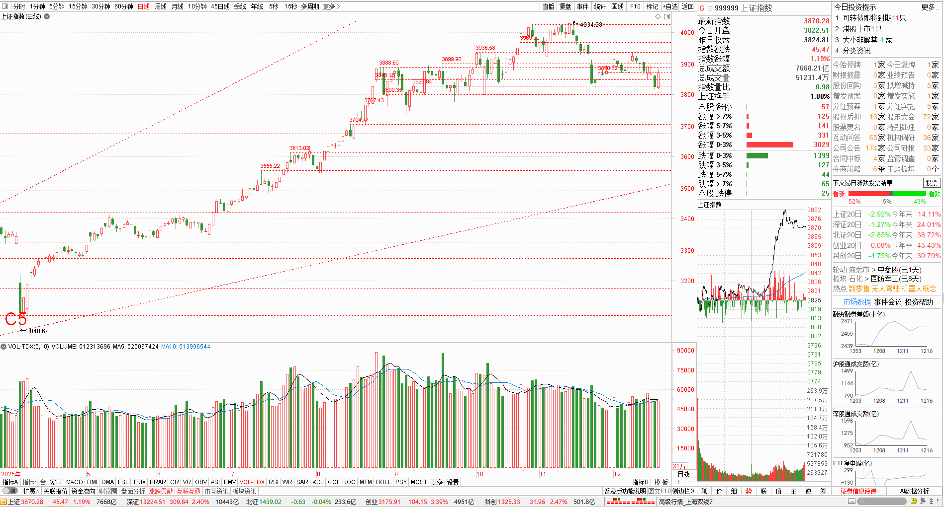 今天股市上攻乏力,导致五大指数整体冲高回落,到收盘时候止,上证微涨0.04%,深证微跌0.49%,北证微跌0.45%,创业板微跌0.56%,科创板微涨0.04%。沪深北三市5464只个股,下跌3332只,跌停25只,上涨1995只,涨停87只。总体行情偏弱。