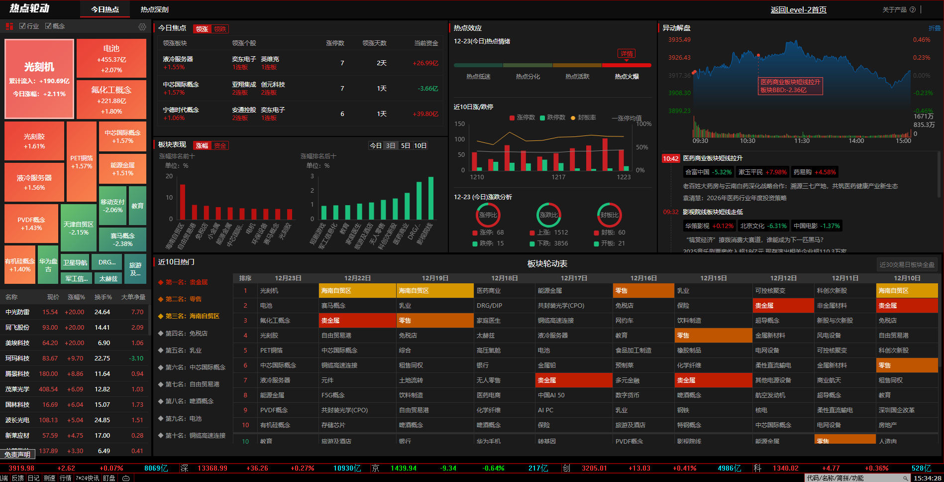 连续4天上涨之后,今天大盘上攻3936受挫回撤,导致整个股市都出现了冲高回落,到收盘时候止,上证微涨0.07%,深证微涨0.27%,北证下跌0.64%,创业板微涨0.41%,科创板微涨0.36%。沪深北三市,5462只个股,下跌3856只,跌停15只,上涨只剩1512只,涨停68只,同上日相比明显转弱。