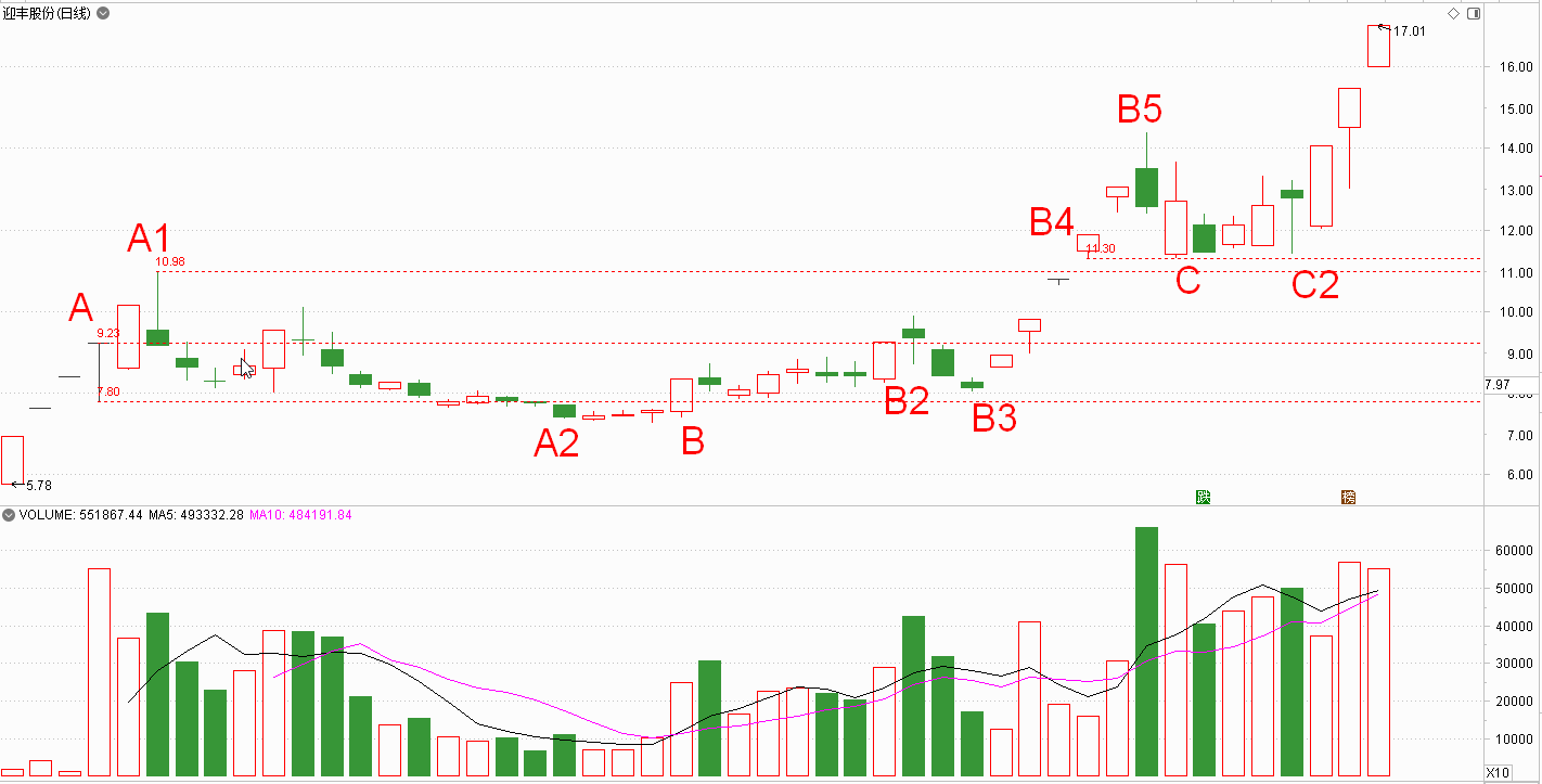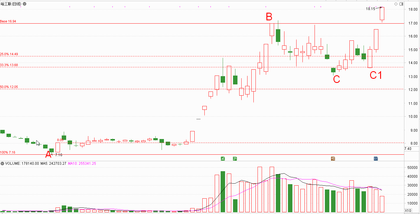 当我们从工具栏中找出百分比画线工具,从B柱的实顶拉到A柱的虚底之后,奇迹出现了。我们可以看到当C柱跌破33线的次日,股价即开始掉头向上站回33线,并于二天后出现涨停。而后,股价继续回踩,当C1踩到33线时,股价再次掉头拉升,并且二次站在25线上。之后,股价连续拉板,顺利突破B柱的压力,站上了一个新的台阶。3325的强大支撑力,由此可见一斑。