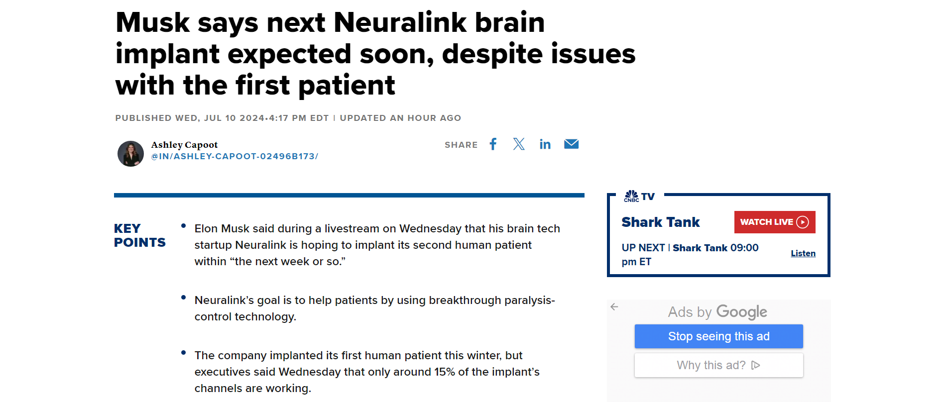 在周三与Neuralink高管的直播中,马斯克表示,该公司希望今年能在“较高的个位数”患者体内植入其设备。目前尚不清楚这些手术将在何时何地进行。Neuralink的一名发言人没有立即发表评论。
