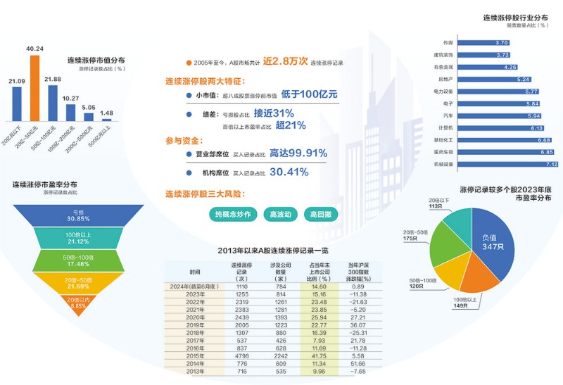 从涨停记录最多的个股质地也能看出特征。据数据宝统计,2015年至今,有30次以上连续涨停记录的个股,截至2023年底市值中位数为52.7亿元,其中市值低于百亿元的个股数量占比超75%;49只个股2023年业绩亏损,占比近47%,还有26只个股2023年底市盈率在50倍以上。