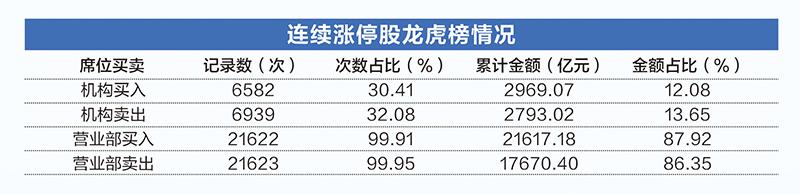 数据宝以龙虎榜数据统计发现,连续涨停股票有机构买入的记录数占比为30.41%,有机构卖出记录占比超过32%;机构累计买入金额占比为12.08%,累计卖出金额占比接近14%。以短线资金为主的营业部资金参与度明显更高,有营业部买入的记录占比高达99.91%,有营业部卖出的记录数占比达99.95%。