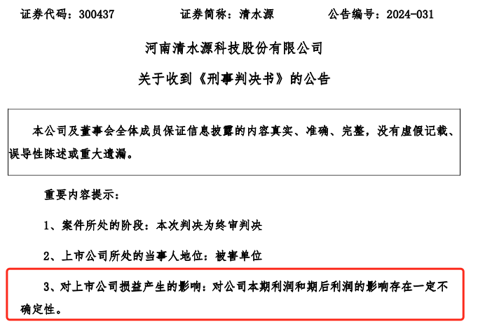 对于此番收到《刑事判决书》清水源也称,本次判决为终审判决,公司将根据案件认定的事实情况结合审计机构意见进行财务报告差错更正,同时公司也将根据判决结果追究对方相应的民事责任。公司对本次判决结果保留提请再审的权利。相关事项对公司本期利润和期后利润的影响存在一定不确定性。