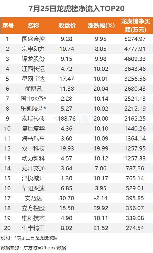 日内上榜龙虎榜个股中,资金净流入最多的是国盛金控,为5274.97万元。数据显示,该股日内涨停收盘,全天换手率4.27%,成交额6.28亿元。资金净流入居前的华鑫上海分公司日内净买入2400.31万元。