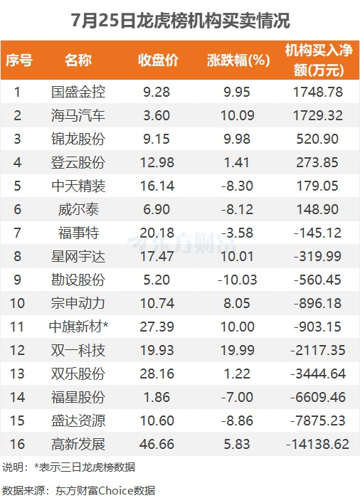机构参与龙虎榜中个股共涉及16股,其中6股被机构净买入,国盛金控被买入最多,为1748.78万元。另外10股被机构净卖出,其中高新发展被卖出最多,为1.41亿元。