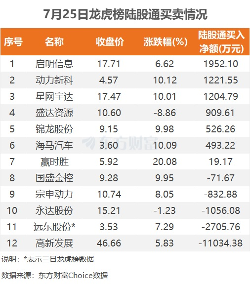 陆股通参与龙虎榜中个股共涉及12股,其中7股被陆股通净买入,启明信息被买入最多,为1952.1万元。另外5股被陆股通净卖出,高新发展被卖出最多,为1.1亿元。