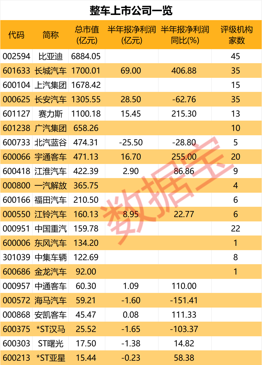 此次车辆报废补贴标准更新对乘用车、商用车等上市公司形成直接利好。证券时报·数据宝统计,A股市场相关企业共计22家,其中市值在千亿元以上的有5家,均为乘用车企。比亚迪市值最高,为6884.05亿元;商用车企龙头为宇通客车,市值471.13亿元。