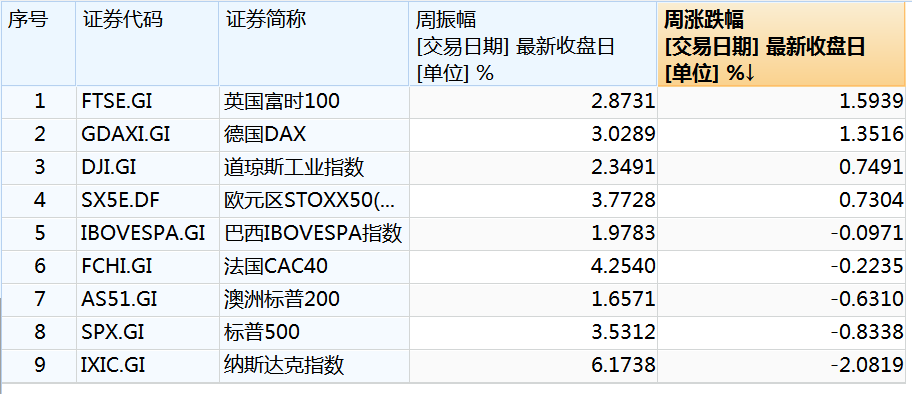 本周,欧洲主要股指多数上涨。其中,英国富时100指数上涨1.59%,德国DAX指数上涨1.35%,欧洲STOXX50指数上涨0.73%,法国CAC40指数下跌0.22%。多国股指出现剧烈波动,德国DAX指数、欧洲STOXX50指数振幅超3%,法国CAC40指数振幅超4%。