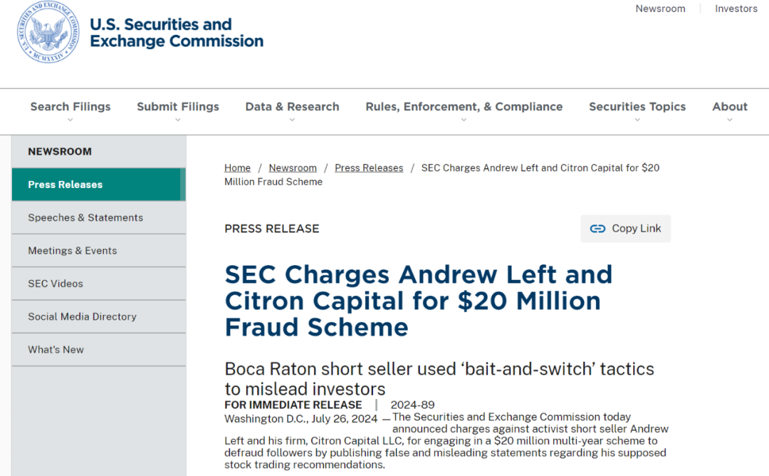 当地时间7月26日,美国证券交易委员会(SEC)和司法部联合宣布,对安德鲁·莱福特(Andrew Left)及其创立的风险投资公司香橼资本(Citron Capital)提起诉讼,指控其涉嫌通过社交媒体平台发布误导性信息,以此获利高达2000万美元。