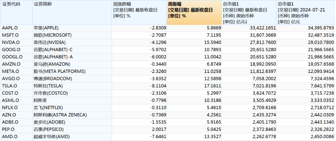 截至最新交易日收盘,纳斯达克市值前15的股票中仅有百事本周上涨2.00%,其他股票悉数下跌。“美股七姐妹”苹果、微软、英伟达、谷歌-A、亚马逊、Meta、特斯拉本周分别累计下跌2.83%、2.71%、4.13%、6.00%、0.34%、2.33%、8.11%,振幅分别达5.87%、7.12%、15.59%、11.00%、6.87%、11.03%、17.16%,市值分别蒸发973.71亿美元、879.99亿美元、1198.02亿美元、1315.04亿美元、65.56亿美元、281.30亿美元、619.76亿美元,市值合计蒸发超5333亿美元(合人民币3.87万亿元)。此外,阿斯麦、超威半导体本周振幅均超10%。