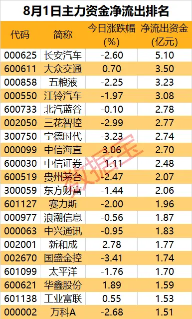 长安汽车主力资金净流出居首,达5.1亿元。此前热门的“涨停王” 大众交通也遭主力资金出逃,金额为3.5亿元。