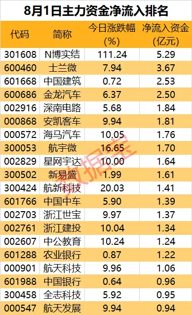 此外,还有中国建筑、金龙汽车、深南电路、安凯客车、海马汽车等个股主力资金净流入规模居前。