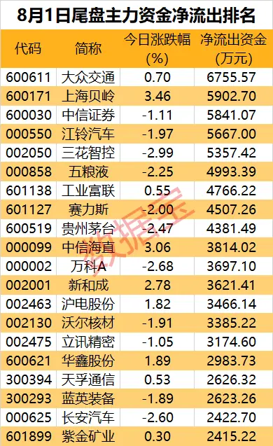据数据宝统计,24股尾盘主力资金净流出超2000万元,其中9股尾盘主力资金净流出超4000万元。大众交通、上海贝岭、中信证券、江铃汽车和三花智控尾盘主力资金净流出均超5000万元。