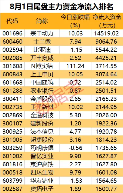 此外,还有士兰微、比亚迪、万丰奥威等尾盘净流入金额居前。