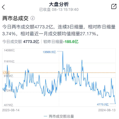 沪深两市全天成交额合计4773.2亿元,较上一交易日缩量185.6亿元,创2019年12月24日以来新低,已连续2日不足5000亿元。