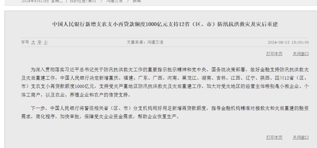 中国人民银行决定新增重庆、福建、广东、广西、河南、黑龙江、湖南、吉林、江西、辽宁、陕西、四川12省(区、市)支农支小再贷款额度1000亿元,支持受灾严重地区防汛抗洪救灾及灾后重建工作,加大对受灾地区的经营主体特别是小微企业、个体工商户,以及农业、养殖企业和农户的信贷支持。