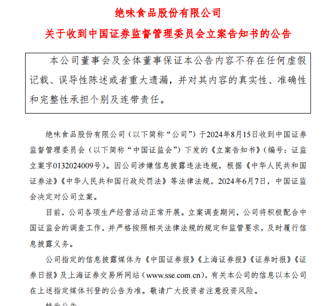 8月15日盘后,绝味食品发布公告称,因公司涉嫌信息披露违法违规,根据《中华人民共和国证券法》《中华人民共和国行政处罚法》等法律法规,证监会决定对公司立案。
