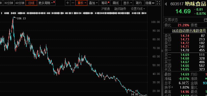 今日,绝味食品股价下跌0.07%,最新收盘价为14.69元/股,该股股价自2021年2月高点一路震荡下行,目前已累计跌近90%。