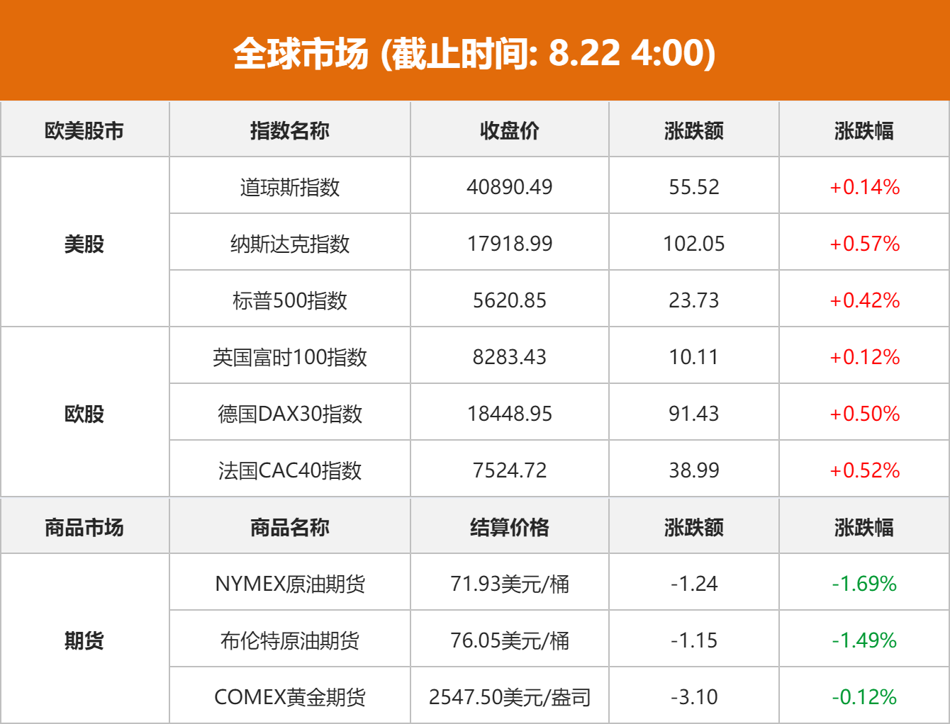 美股:纽约股市三大股指21日上涨,截至当天收盘,道琼斯工业平均指数比前一交易日上涨55.52点,收于40890.49点,涨幅为0.14%;标准普尔500种股票指数上涨23.73点,收于5620.85点,涨幅为0.42%;纳斯达克综合指数上涨102.05点,收于17918.99点,涨幅为0.57%。
