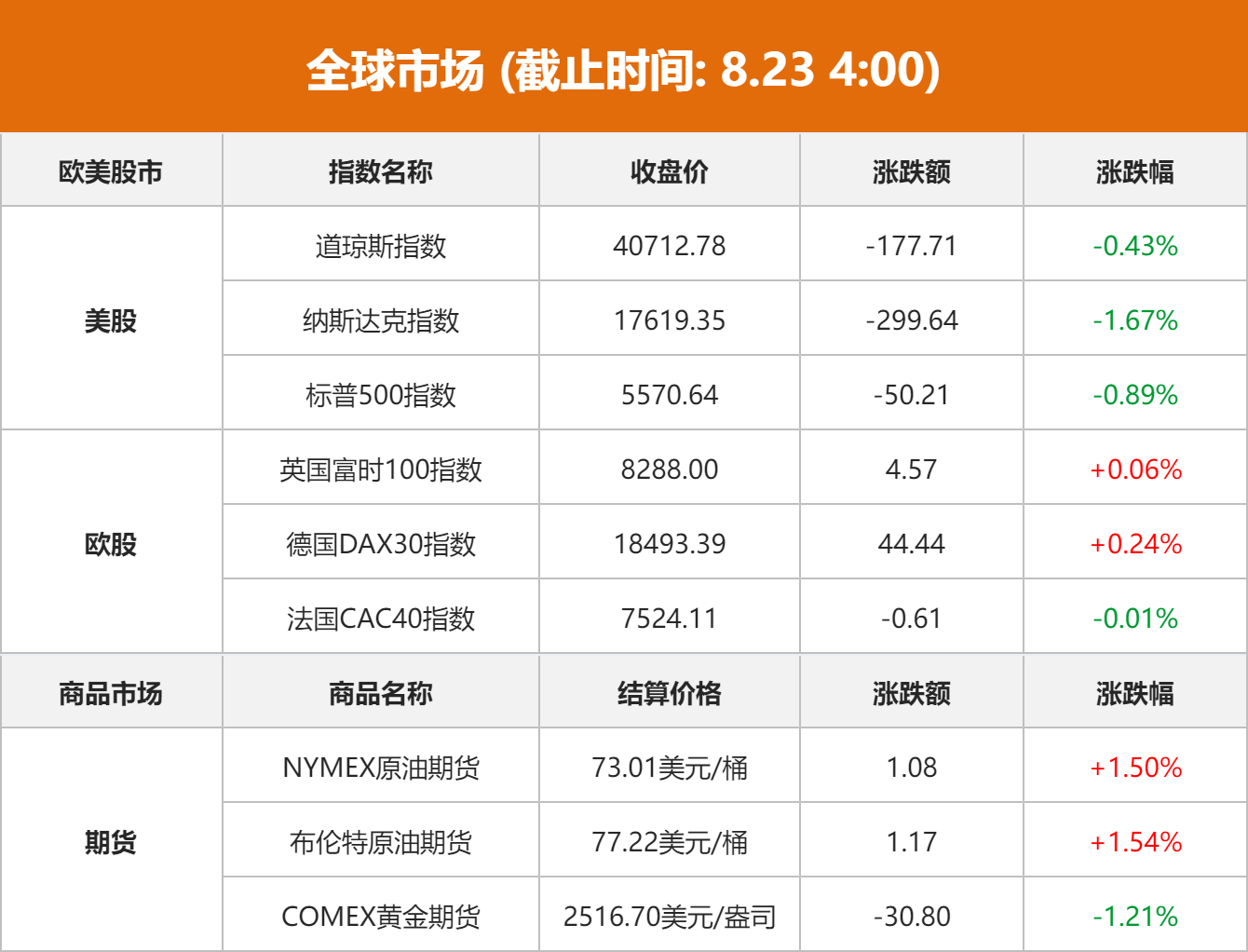 国际原油:纽约商品交易所10月交货的轻质原油期货价格上涨1.08美元,收于每桶73.01美元,涨幅为1.50%;10月交货的伦敦布伦特原油期货价格上涨1.17美元,收于每桶77.22美元,涨幅为1.54%。